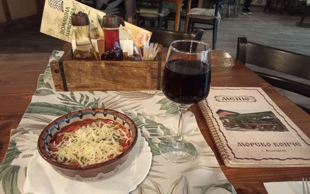 Par contre, je déjeune en solo d’une spécialité locale : Cheese Thracian Style. C’est un plat avec de la fêta, des tomates et des saucisses cuites au four accompagné d’un verre de vin rouge avec cépage pino noar !