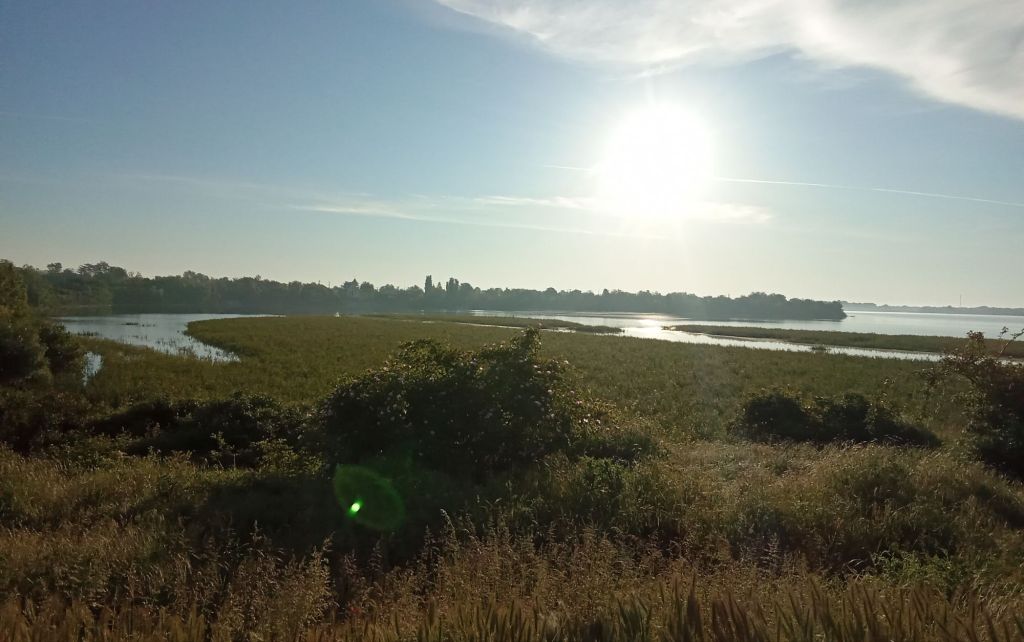 Réveillé vers 6h du mat’ par le chant des oiseaux et du canon pour les effrauer dans le champ de maïs. Je n’ai été attaqué ni par les loups, ni par les chacals. Papy voulait tout simplement que je décampe. J’ai bien fait de rester. Je plie les gaules. Puis j’emprunte le chemin pour retrouver le village en admirant le lever de soleil sur le lac.