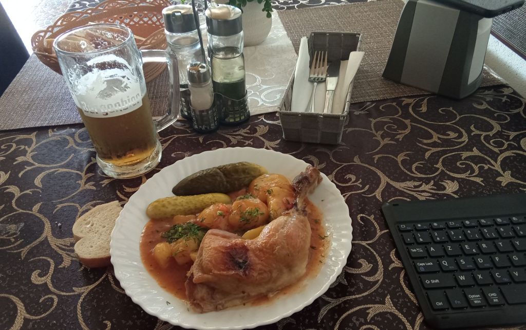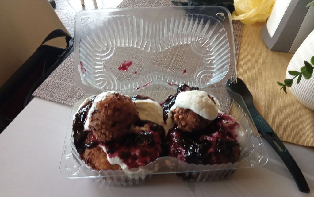 Et là, arrive mon dessert du jour à moi : la spécialité roumaine en double exemplaire !!! C’est énorme dans tous les sens du terme. Je leur fais comprendre que je viens de débarquer à vélo et que je ne peux pas embarquer la barquette dans ma barque à roulette. Je vois bien qu’elles sont embarrassées et je ne voudrais pas les braquer. Finalement, j’avale un des deux monstres. C’est délicieux. Cela s’appelle un papanasi (sic !). C’est un beignet au fromage blanc sucré recouvert de myrtilles et, généralement, servi par deux. Le deuxième fera mon repas du soir.
