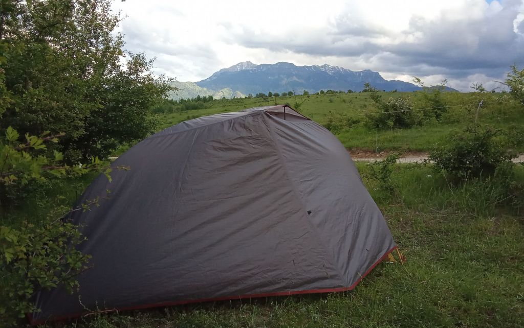 Sur la route de la vallée, je repère un mont qui domine la bourgade de Tohanu Nou. Je m’y dirige. Après une belle grimpette sur un mauvais sentier, je trouve un emplacement en bordure de chemin, à l’abri du vent et avec vue sur ce sommet enneigé. Il fait grand beau quand je plante mon bivouac. Mais le temps de boire l’apéro et de casser la croûte, de gros nuages s’amoncellent sur les sommets. La pluie est de retour. J’ai juste le temps de tout ranger et de rentrer mettre à l’abri. Il est 19h00. Je suis déjà rentré ! L’orage éclate.