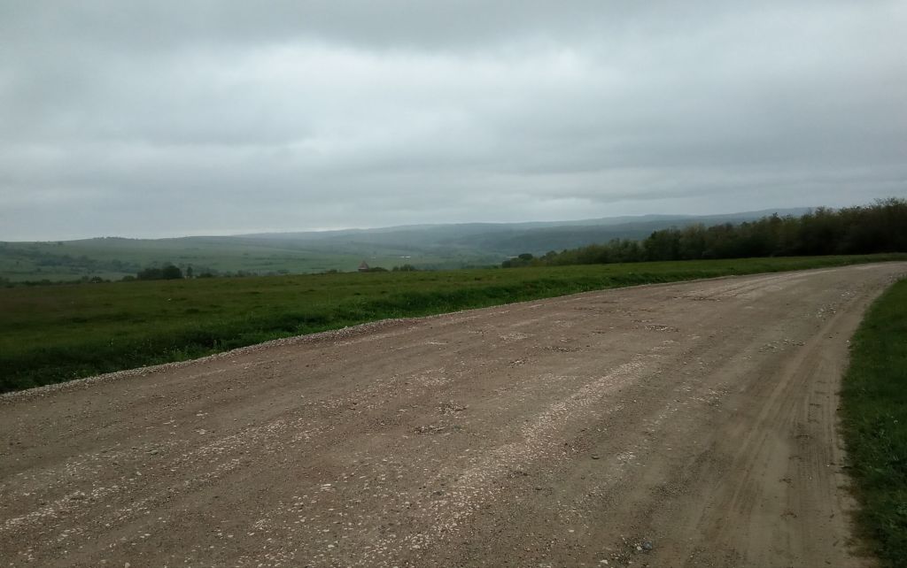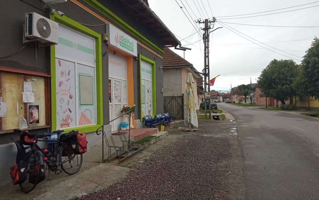 Ce matin, avec l’humidité ambiante et le froid inhérent, c’est à 5h42 que je me réveille. J’enfile mon tee-shirt à manches longues et je replonge pour émerger 1h plus tard. Le plafond est bas en ce samedi matin. Je n’aperçois même plus les sommes des Carpates. Je plie le bivouac sans avoir vu ni loup, ni chacal, ni loup. Tant mieux. Il faut dire que je suis en plaine et pas très loin du village. Village que je vais rejoindre dans la foulée pour déjeuner dans ces supérettes qui détonnent un peu dans le décor. Ce sera café/croissant (sous cellophane) à la confiture/bananes.