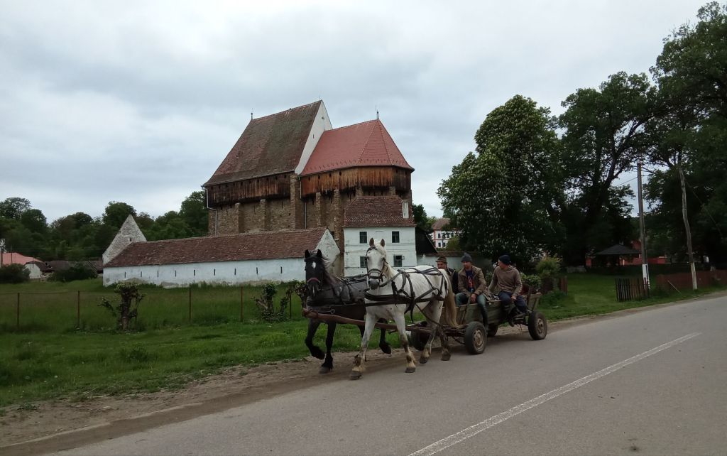 A la sortie de village, je découvre une nouvelle église catholique fortifiée après celle de Barcut. Et, coup de bol, j’ai l’attelage qui passe au même moment. « Bouna dias ! ». Je rentre à l’intérieur des murs. Un homme ponce des poutres dans une des pièces du bâtiment blanc à gauche. Je lui demande si je peux visiter. Il acquiesce mais l’église est fermée à double-tour. Dommage.