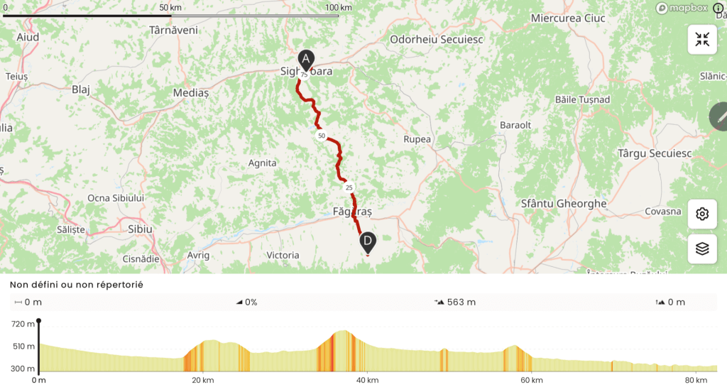 Il est désolé de ne pouvoir m’aider mais m’indique un réparateur vélo à Odorheiu Secuiesc (sic!) un peu plus à l’est. Je m’y rendrai lundi. Ce n’est pas bloquant mais c’est quand même enquiquinant de ne pas pouvoir poser HakaOne où je veux. Je pars ensuite à la recherche d’une station de lavage avant de me rendre à mon hébergement pas très loin du centre historique. C’est un studio charmant pour 26€ la nuitée. Demain dimanche, je vais pouvoir déposer les sacoches, me poser au chaud, me reposer tranquillou.