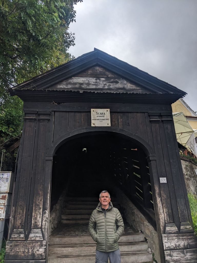 Je me fais tirer le portrait devant ce long corridor datant de 1642 qui mène à l’église de la colline (Biserica din Deal) …