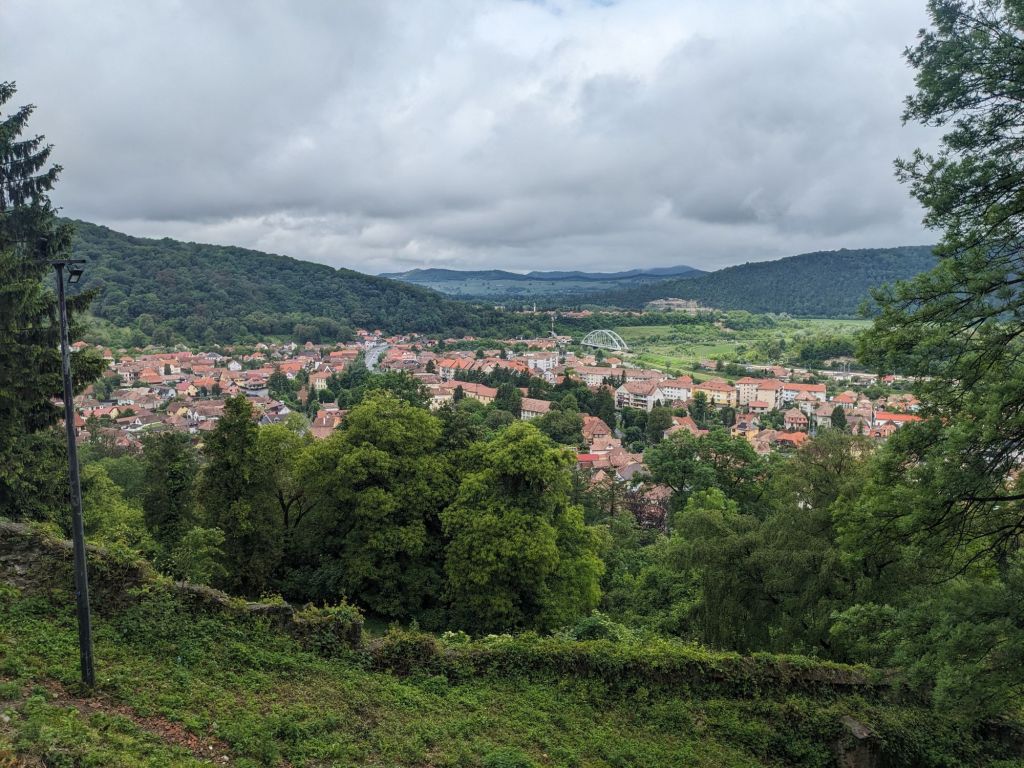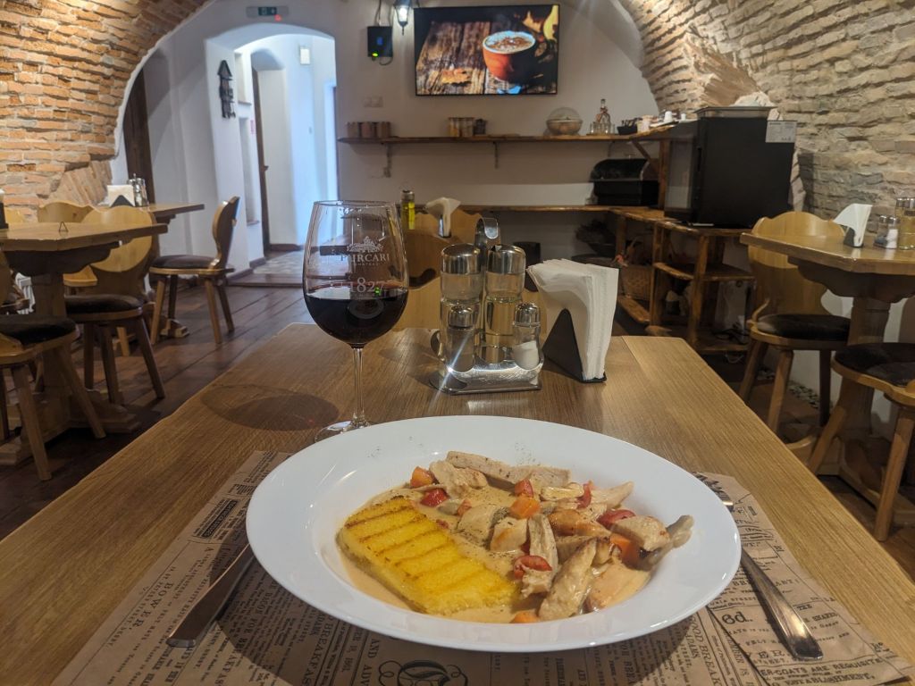 Puis, en me baladant dans les ruelles de la cité, je repère le restau d’une pension un peu à l’écart des restaus à terrasse et touristes. Je déguste une spécialité locale (poulet mijoté traditionnel de Transylvanie avec polenta) accompagné d’un bon verre de vin roumain suivi, en dessert, d’un gâteau maison à la cerise servi, comme le papanasi, en double !
