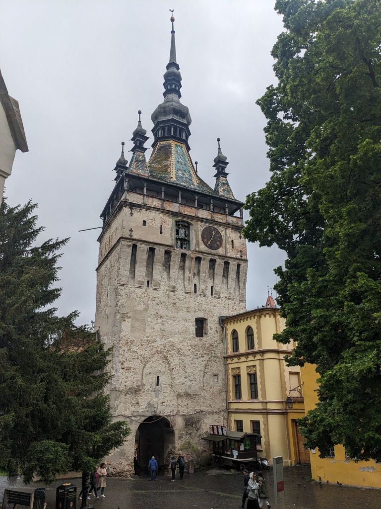 Après ces infos, je pars à pied en balade vers la cité médiévale à 800m de mon appart. J’y arrive par la porte principale avec son lycée international J. Haltrich à gauche et sa magnifique Tour de l’Horloge.
