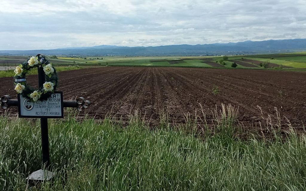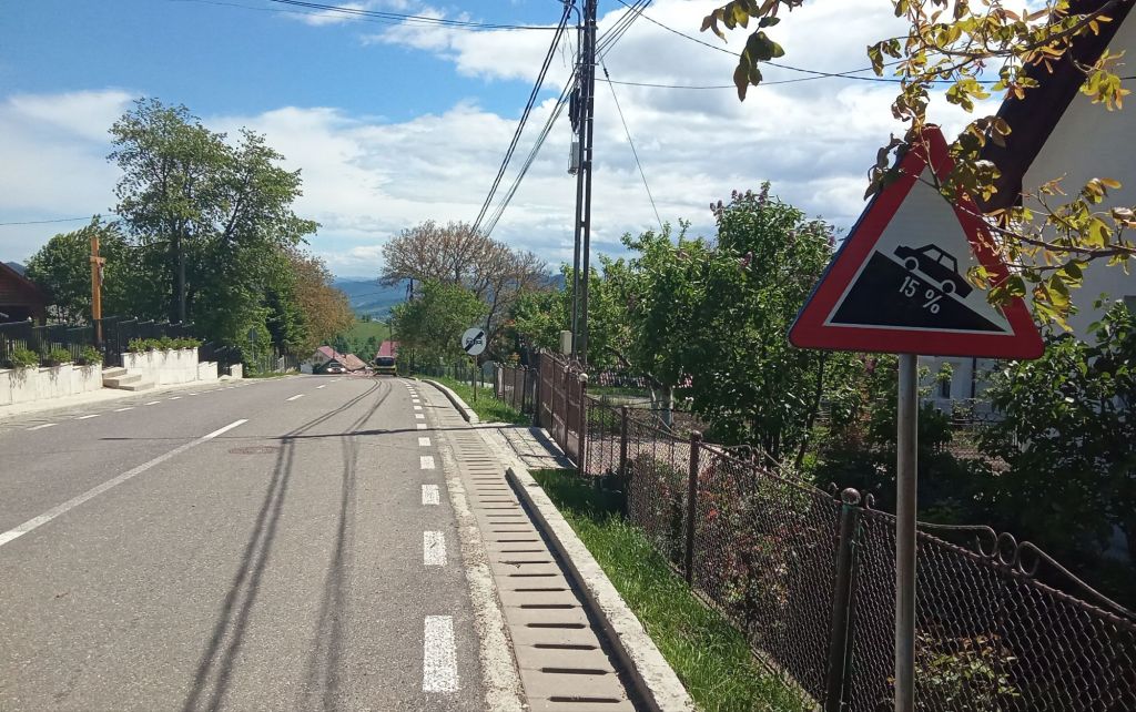 Après 15 minutes intenses pour sortir du bordel matinal et d’embouteillages monstres dans cette grande ville de 75.000 habitants, je retrouve la route par laquelle je suis arrivé hier. Ça monte et descend toujours autant. Par contre, un fort vent du nord est en train de chasser les nuages qui encombrent les sommets des Carpates à l’ouest. Sur cette photo, une stèle, en forme de croix de fer, commémore une des nombreuses victimes d’accident de la circulation.