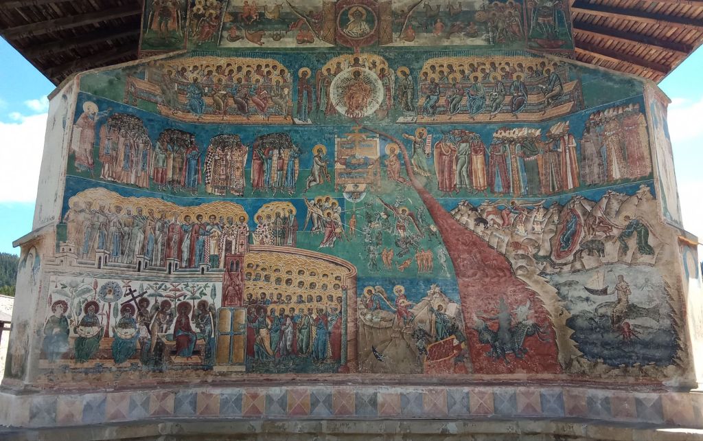Cette église orthodoxe roumaine a été bâtie en 1488 à la suite d’une victoire contre les Ottomans. Ce monastère de Voronet est un monastère de Bucovine. Le fronton représente l’entrée au purgatoire avec la descente aux Enfers ou la montée au Ciel.