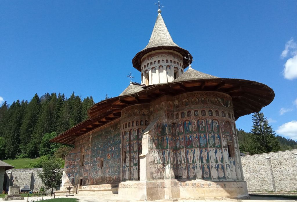 A l’intérieur, de grandes fresques peintes couvrent tous les murs. C’est assez vertigineux. Je prends cette scène où les saints se font décapités. Alors que j’admire ces peintures, je suis accosté par un munichois. Il est en voyage de groupe et fait également des voyages à vélo. On papote un moment avant que son groupe ne le rappelle. Puis je file au monastère de Humorului. Malheureusement, celui-ci est en pleine restauration. Dans celui-ci, je rencontre deux parisiennes retraitées de l’enseignement. Elles se font un road-trip en train+voiture pendant 2 semaines à travers le pays. C’est sympa de pouvoir changer en français.