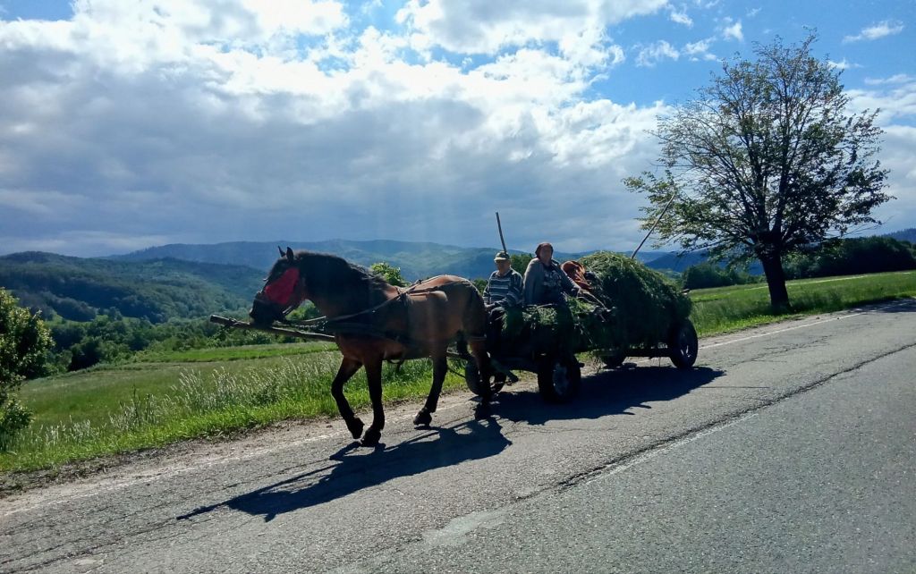 Sur la route, je croise un couple qui rentre des champs. Alors qu’ils arrivent vers moi, je leur demande l’autorisation de les prendre en photo. Multumesc mult (merci beaucoup) ! Au loin, on aperçoit les cimes des Carpates où les nuages noirs s’accumulent. Je ne vais pas monter là-haut ce soir.