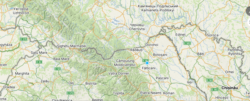 Avant de prendre la route, un point géographique pour me situer. Je me trouve au niveau du point bleu. Les frontières sont matérialisées par les traits noirs. A l’est, c’est la Moldavie avec sa capitale Chisinau. Au nord, c’est l’Ukraine. Et, à l’ouest, la Hongrie. Je vais partir plein ouest vers la Hongrie. J’ai hésité à monter au nord et suivre la frontière à l’intérieur de l’Ukraine, mais cela craint trop.