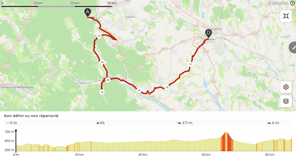 C’est pas le tout mais il me faut reprendre la route. Je suis sur la route DJ717 longeant la rivière Humor mais qui mène à un cul-de-sac en fond de vallée. Il me faut couper à travers un mont des « pré-Carpates » pour basculer dans la plaine. Je dois donc monter au village de Plesa avant de redescendre de l’autre côté pour rejoindre la bourgade de Partestii. Et là, c’est du brut ! Ça grimpe à 15% de ce côté pendant plus d’un kilomètre. Je monte en zigzaguant comme en ski de rando.