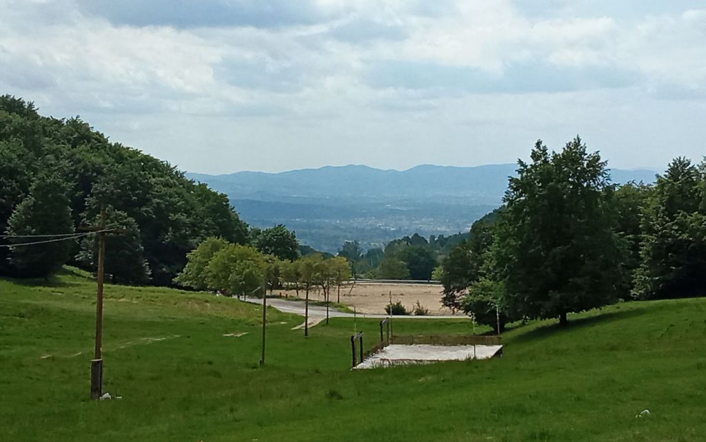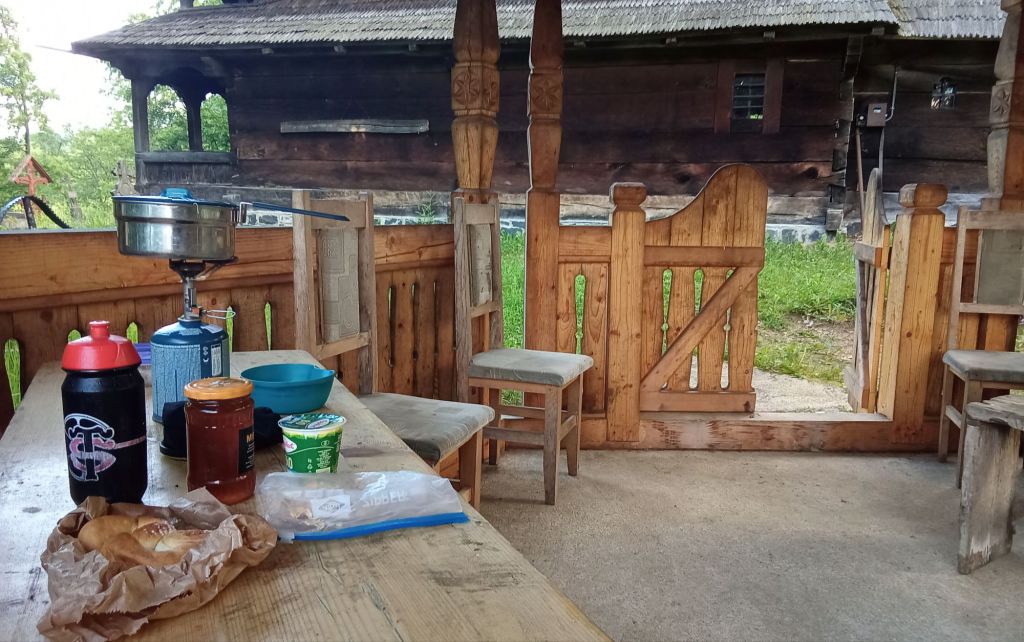 Alors que je continue de suivre la frontière mais, cette fois-ci forestière, je grimpe un col jusqu’à 645 mètres pour rebasculer dans la plaine. Arrivé au sommet, une gargote m’invite à me poser. Je déjeune de 2 saucisses roumaines et de morceaux de fromage de brebis et de vaches. Je les trouve un peu fades.