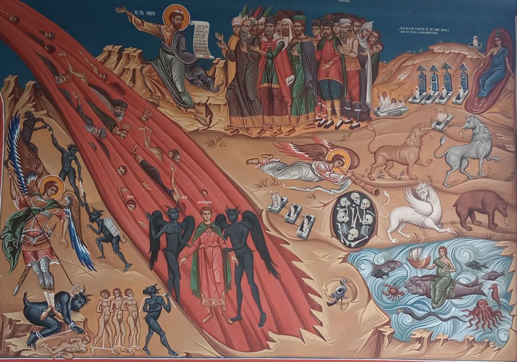 J’espère y venir un jour une fois le conflit terminé et les russes chassés. Et j’espère que Poutine ainsi que le génocidaire Nétanyahou et les tirans du Hamas, Trump et tous les oligarques et dictateurs de par ce triste monde glissent en Enfer, comme sur cette peinture du porche de l’église du cimetière.