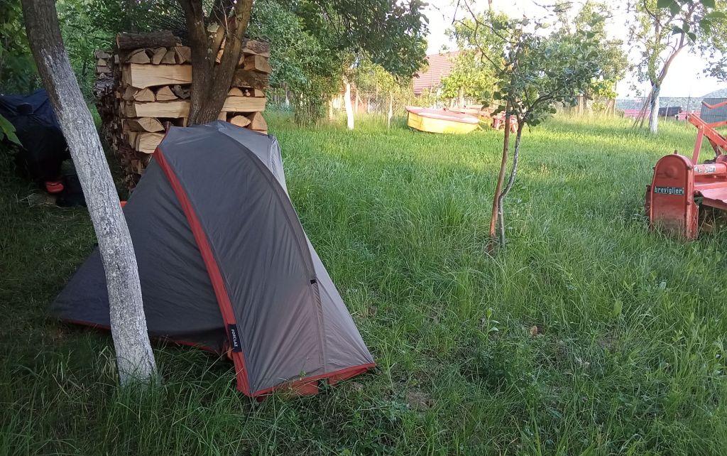 Je monte ensuite la route DJ109K qui me mène à la bourgade de Calinesti-Oas qui domine un grand lac artificiel. Je m’arrête dans le premier M.M pour y acheter une bonne glace au chocolat (le thermomètre d’une pharmacie en ville indiquait 35°C !) et y faire mes emplettes. Les nuages s’amoncellent sur cette hauteur. Il ne faut trop que je tarde à trouver un endroit. Alors que je sors de cette bourgade avant d’attaquer la descente qui mène au lac, j’aperçois une grande maison en bord de route qui me semble à l’abandon. Je vais faire un tour derrière. Il y a un terrain qui m’attend ! De là, je vois un bout du lac. Ce sera parfait pour ce soir.