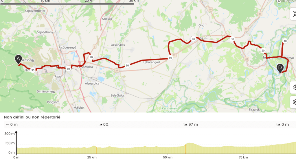 Réveillé à nouveau aux aurores. Après avoir plié les gaules et déjeuné sur l’herbe (thé/pain/miel … Le frigo est vide !), je sors de ma forêt peu après 7h du mat’. Après 1km de piste et 3kms de route, je rejoins le village. Puis je reprends ma route en direction de Tokaj (prononcé Tokoï). Mais, en cette belle journée printanière, les contrariétés débutent.