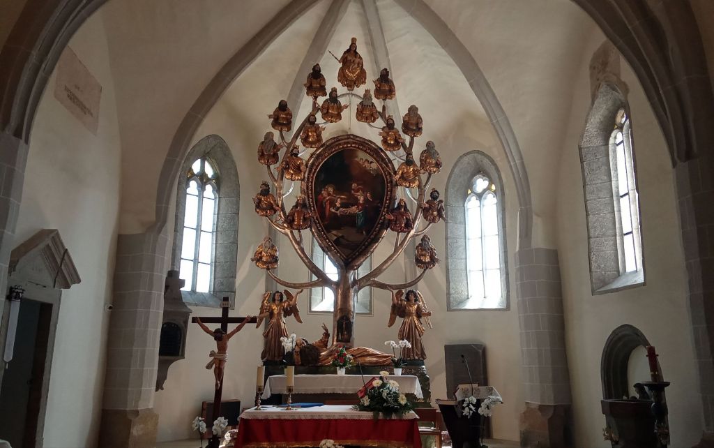 L’intérieur y est très sobre si ce n’est cet arbre des saints au-dessus de l’autel.