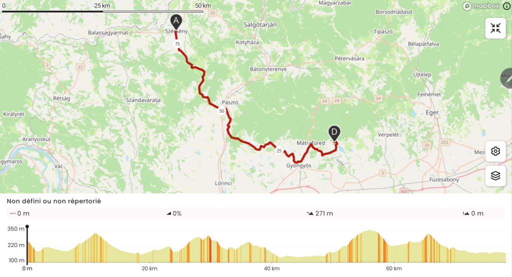 Je retrouve la route 2426 et la grimpette recommence. Puis j’emprunte la route 24 qui m’emmène à la ville de Gyöngyös que j’évite en suivant une piste cyclable par les quartiers nords. Cette trace correspond à la mienne et à celle de l’EV14 et route cycliste n°1. Donc tout va bien ! Puis, en sortant de cette ville, j’attaque les coteaux plantés de vigne. Cette mauvaise piste permet d’éviter la route rectiligne 2406.