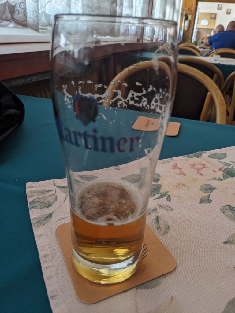 Il est bientôt midi et je commence à avoir faim. Depuis ce matin, je n’ai vu aucun café. Et les commerces ne sont que dans les grosses bourgades. Ma gourde est presque vide. J’arrive enfin dans le village de Litava où se trouve une Coop. Pas de bol, elle est fermée pour inventaire. Je dois encore continuer jusqu’à la bourgade de Bzovik pour trouver un restau fermé, mais qui fait encore bar, et une Coop. J’en profite pour faire mes emplettes vu que le frigo est vide. Puis je reviens m’installer dans le bar pour y déguster une Martiner, ma première pivo slovaque et y dévorer mon sandwich.
