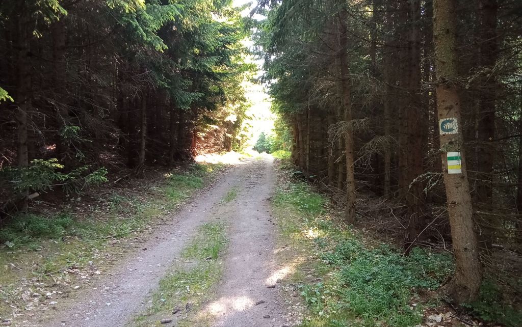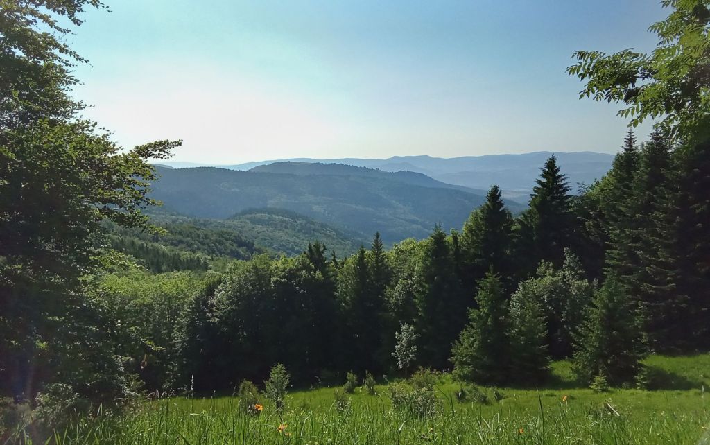 A part quelques passages empierrés, cette piste est praticable. Je profite d’une trouée à travers la forêt que je traverse pour admirer le paysage de ces montagnes slovaques culminant à 1.000 mètres d’altitude.