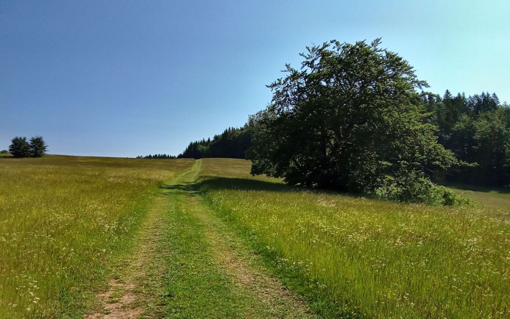 Après être sorti de la forêt, je me retrouve, toujours sur la piste de ski de fond n°4, au milieu de vastes prairies. Le ciel est bleu. Le soleil chauffe. La nature est superbe. La vie est belle !