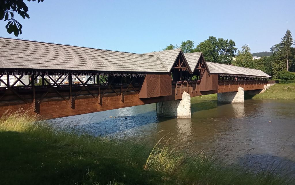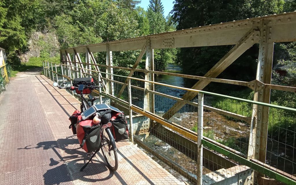 L’heure avance. Il est bientôt 16h30. Je reprends ma route et longe maintenant la rivière Orava. Je passe devant ce superbe pont en bois pour cyclistes et piétons. Je continue toujours sur une voie cyclable empruntée à nouveau par de nombreux cyclistes. Je croise notamment des couples en mode Gravel. Au village suivant, je m’arrête devant la Coop pour faire quelques emplettes. Il est 17h01. Elle vient de fermer. Bien que je sors mon sourire le plus charmeur, la patronne, à l’intérieur, me regarde et me fait signe « Désolé ! ».