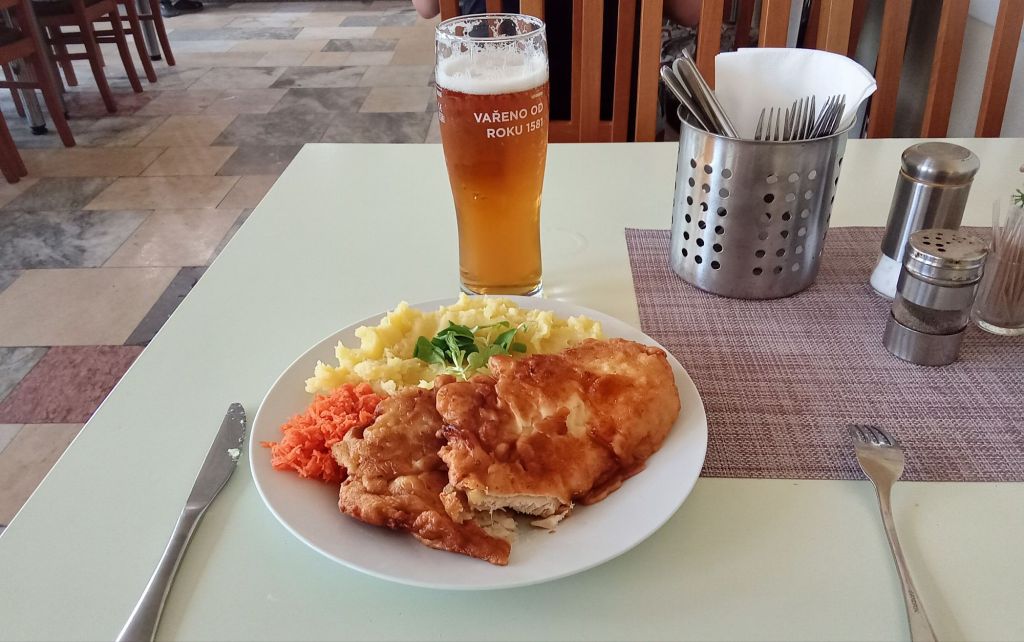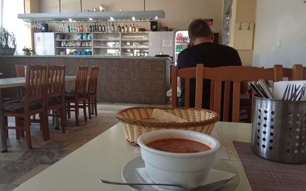 Peu après midi, j’arrive dans la bourgade de Lisková. J’y trouve un restau ouvrier posé le long du stade de foot local. Je prends le menu du jour. En entrée, ce sera soupe comme partout dans ces pays de l’est …