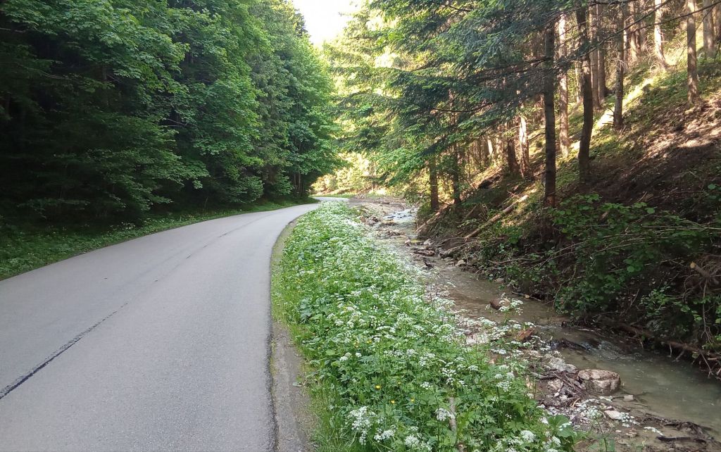 Je grimpe tranquillou sur cette pente régulière à 6 ou 7%. Le cadre est idyllique : la forêt à gauche qui me fait de l’ombre, le torrent à droite et les oiseaux au-dessus qui me font la musique.