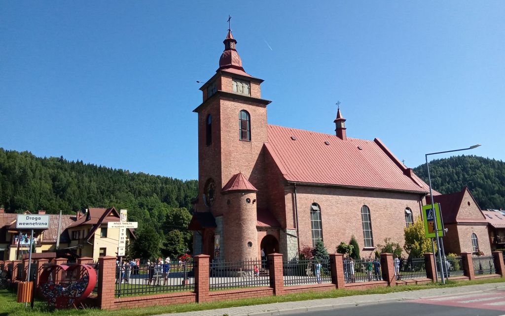 J’attaque la grande descente toujours sur cette belle route 957. J’arrive dans la vallée. Je vais longer la rivière Skawica. La route est pratiquement plate et de bonne qualité. J’ai un léger vent qui me pousse au cul. J’envoie du lourd. Je roule à 27km/h de moyenne. Que du bonheur … En traversant le village du nom de la rivière, je suis attiré par toutes ces personnes qui sont figées sur le parvis de l’église. Dans les autres villages, j’avais déjà remarqué beaucoup de monde qui se rendait à la messe dominicale. Dans ce pays, la religion catholique est presque une institution d’état.