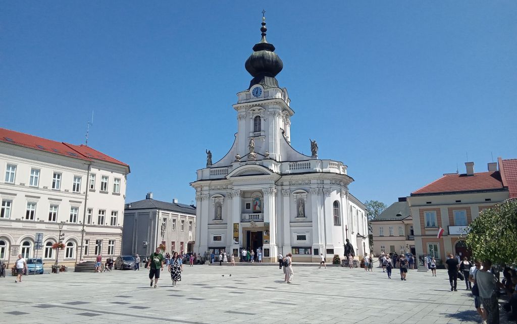J’y arrive à la fin de la messe. Quelques personnes sont à nouveau debout à l’extérieur faute de place à l’intérieur. Alors que je m’apprête à prendre cette photo, je suis interpellé par un cyclotouriste polonais. Il est en vadrouille pour quelques jours et a déjà fait quelques périples dans et autour de la Pologne. Il est très curieux de connaître mon équipement (tente, panneau solaire, GPS, …). Je le quitte pour aller déjeuner dans un des restaus du centre. Ce midi, j’opte pour la spécialité maison : « De volaille« . C’est une belle pièce de poulet, enroulée et panée dans une farce, servie avec PdT et légumes. Pas de photo vu que mes appareils sont en cours de recharge au comptoir.