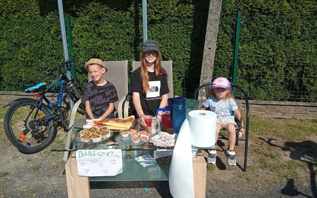 Alors que j’arpente toujours de petites routes de campagne, je passe devant un trio tenant stand. Je m’y arrête pour boire une verre de jus de cerise et manger un gâteau. C’est toujours un plaisir de voir des jeunes essayer de se faire de l’argent de poche de cette façon. Cela me rappelle l’Irlande l’an dernier et le Danemark il y a quelques années déjà. Par contre, les pôvres sont un plein cagnard