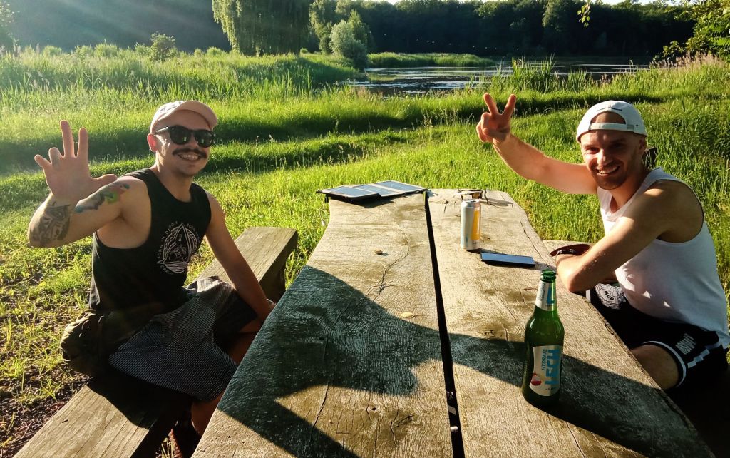 Alors que je rédige ces lignes et que j’ai déjà vu passer quelques VTTistes qui me saluent en passant, deux jeunes s’arrêtent pour faire une pause. Ils s’installent et, par traducteur interposé, on échange. En blanc, c’est Mateus. En noir, c’est Pavel. Lui fait du tir sportif avec un lance-pierre (en l’occurrence des billes d’acier). Il arrive à toucher une branche à 50 mètres. Impressionnant. De plus, j’ai droit à ma bière (sans alcool) mais qu’est-ce qu’elle est appréciée. Merci les gars pour ce moment de partage.