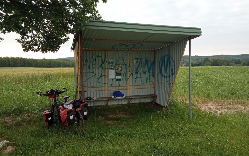 Après avoir croisé un jeune couple en mode Gravel, je rejoins enfin la grande route 74 qui me permet d’enjamber la rivière et de continuer ma remontée vers le nord-est. Juste après le pont, j’entre dans la ville d’Annopol. En la traversant, je tombe par chance sur un magasin ouvert. Je fais le plein d’eau et mes emplettes (thé, yaourt, pain, bière et cacahuètes, chocolat noir, …). Le basic quoi !