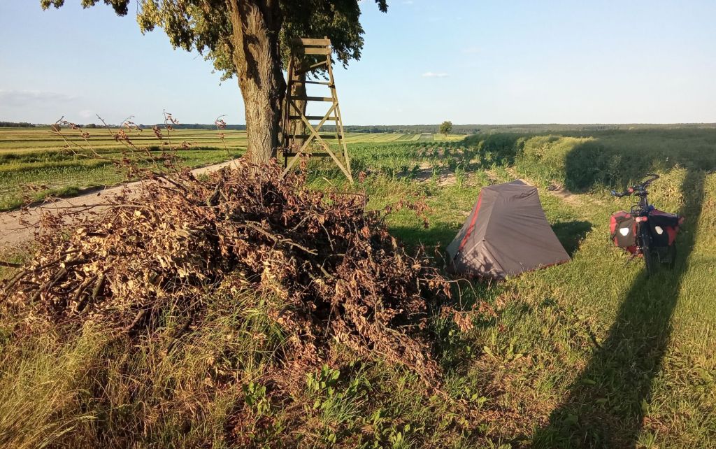 Par contre, en sortant de la ville, ma trace m’envoie direct sur un chemin sablonneux. Je la modifie pour passer un peu plus au nord et trouver une route bitumée … qui se termine aussi par un chemin. Je le remonte un certain temps après m’être fait doubler par un jeune en squad qui s’éclate sur la piste. Peu avant de retrouver la route bitumée et la vie civilisée, je repère un endroit où je peux planter ma tente. Par contre, le vent, à décorner les cocus, souffle fort à travers la plaine. J’installe la tente à l’abri d’un amas de branches.