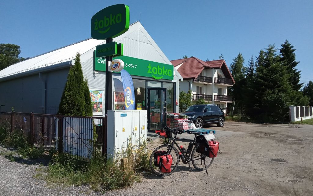 Je traverse à nouveau de nombreux hameaux, bourgs, bourgades, villages mais, à part quelques supermarchés dans les gros villages, je ne trouve aucun café, ni boulangerie. C’est vraiment la cambrousse ! Vers 10h, je rejoins une grande route longeant la voie ferrée et ma piste cyclable. Je fais u crochet pour m’arrêter dans ce Zabka. J’y prends un grand café (vraiment grand) accompagné d’un muffin au chocolat évidemment. Les deux jeunes femmes tenant cette boutique sont en plein déchargement de la palette devant le magasin. Cela ne rigole pas trop …