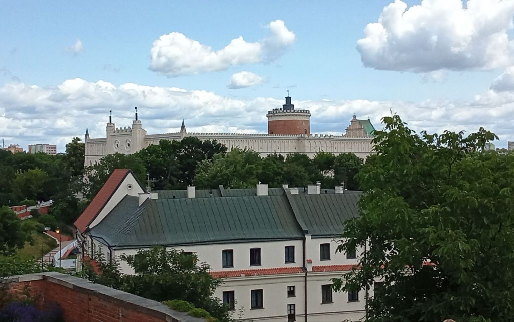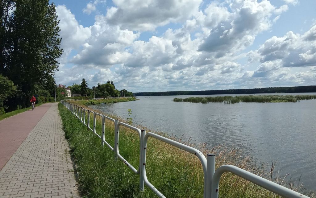 Je passe ensuite devant un quartier résidentiel aux luxueuses maisons. D’ailleurs, je croise un des propriétaires au volant d’une Porsche décapotable. Le contraste est quelque peu saisissant. Puis j’arrive à cet immense lac artificiel, au sud de Lublin, alimenté par la rivière Bystrzyka. Je n’ai plus qu’à suivre cette magnifique piste cyclable, de couleur rouge pour la séparer visuellement de la partie piétonne, pendant presque 13 kms. Elle me mène jusqu’à la vieille ville. C’est en fait une coulée verte qui suit le lac puis la rivière. Génial !
