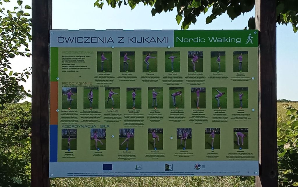 Je suis à nouveau une trace vélo fléchée en noir. Il y a également une trace marche nordique avec ce panneau pour des illustrations d’échauffement.