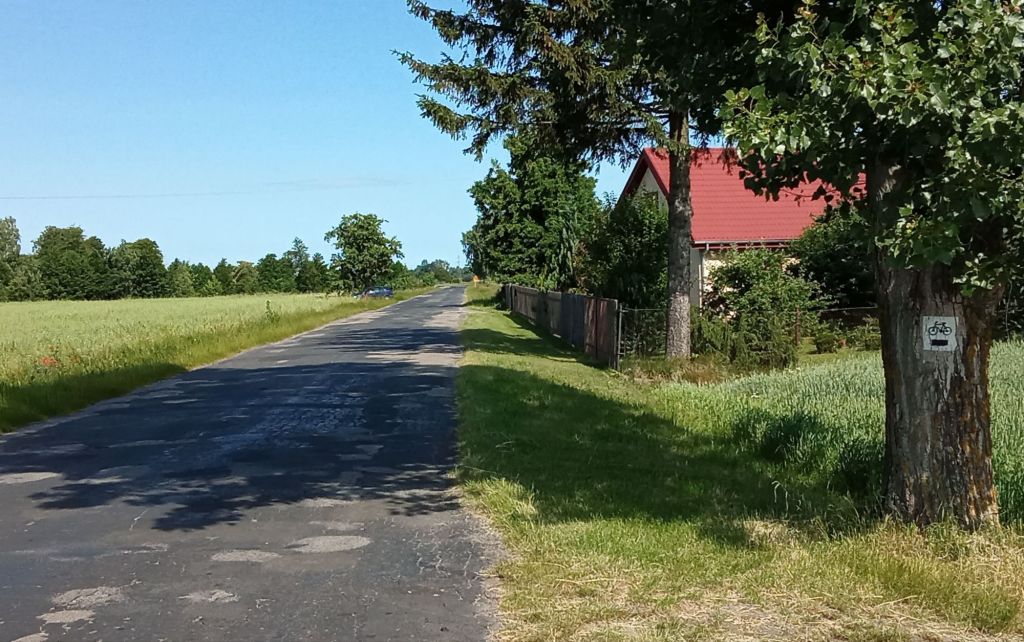 Alors que j’enjambe la rivière Wieprz, un cycliste en mode gravel me double. Pas un bonjour, pas un signe. Rien. Le gars me double dans la montée du pont et accélère dans la descente. Il y a vraiment des cons partout ! Comme je suis joueur, j’embraye grosse plaque, mets la tête dans le guidon et lui mets la pression. Je le double quelques kms plus loin après qu’il se soit arrêté pour boire un coup ! Quant à moi, je file bon train en suivant toujours mes marques noires comme cela sur l’arbre à droite.