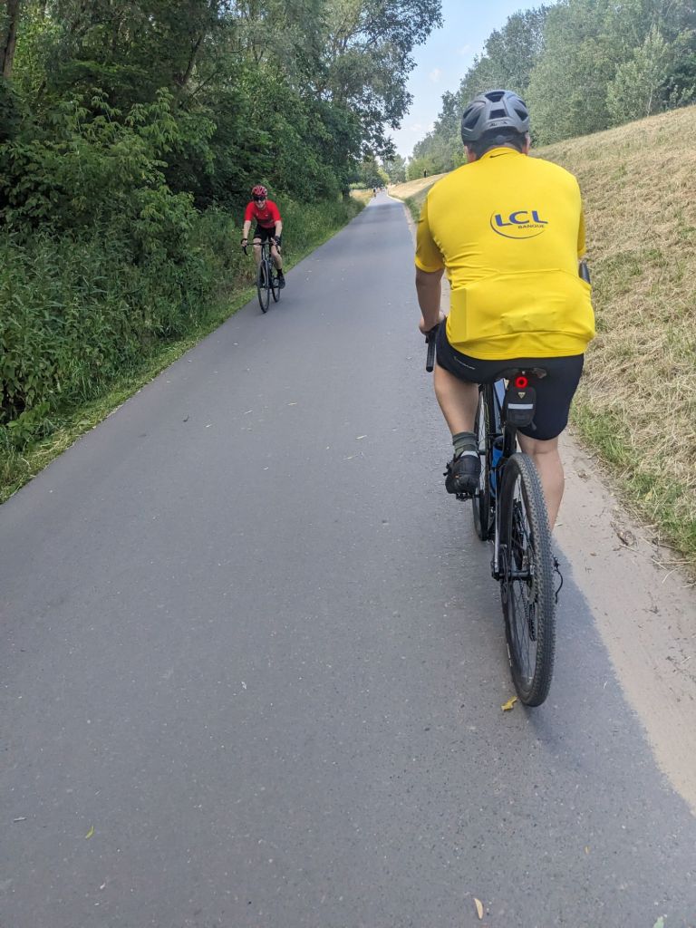 Arrivé de l’autre côté, je trouve une magnifique piste cyclable qui longe la rivière. Nous sommes dimanche matin. Et, comme mes potes du Stade Toulousain Cycliste et du Vélo Club Blagnac, ça roule fort. J’arrive à choper la roue du Pogacar local légèrement embonpointé. Mais il me permet de bien couper le vent. Il a beau essayer de me décrocher, je m’accroche comme un morpion. A un moment, il met le clignotant à gauche. J’en fais de même.