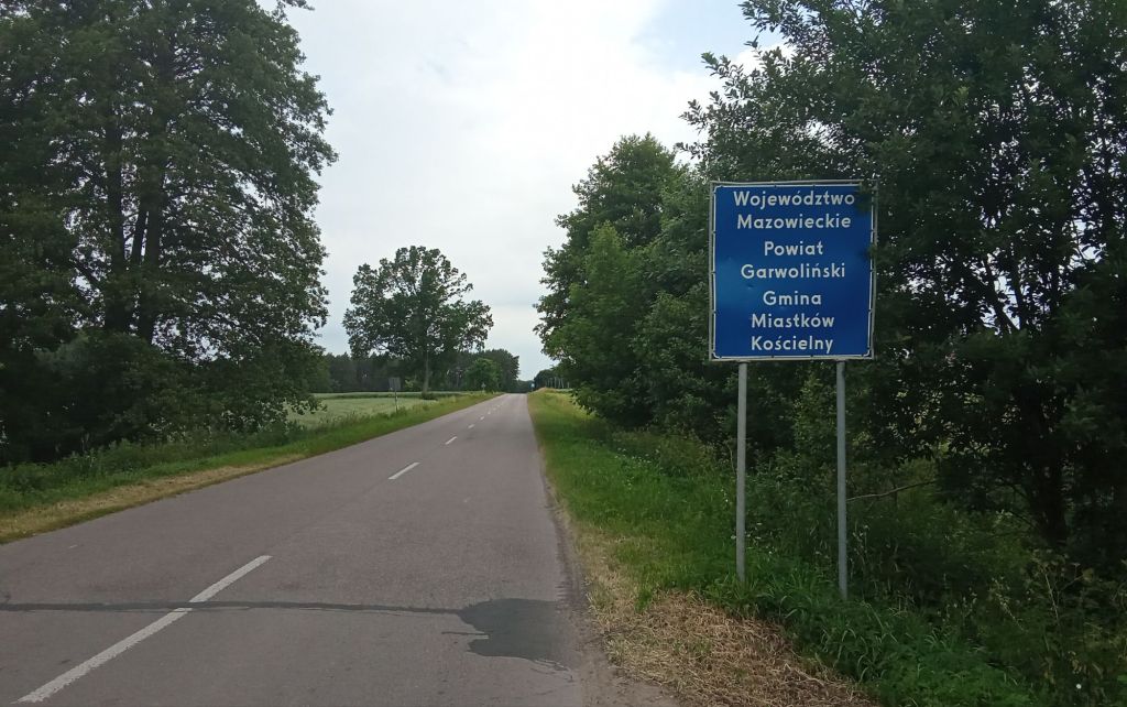 Après 500 mètres de chemin, je récupère ma route campagnarde qui longe la petite rivière Wilga. Quelques kms plus loin, je change de commune municipale (Gmina). J’arrive dans celle de Miastków Koscielny. C’est, pour moi, ce qui correspond au village avec église et commerces. Cette commune (Powiat) est rattachée au district de Garwolinski. Comme dans tous ces pays de l’est, les initiales (2 ou 3 lettres) de ce district composent le n° de la plaque d’immatriculation. Ici, ce sera GW. Ce district dépend de la région administrative (Województwo=voïvodie) de Mazowieckie (Mazovie). Ils existent 16 régions administratives.