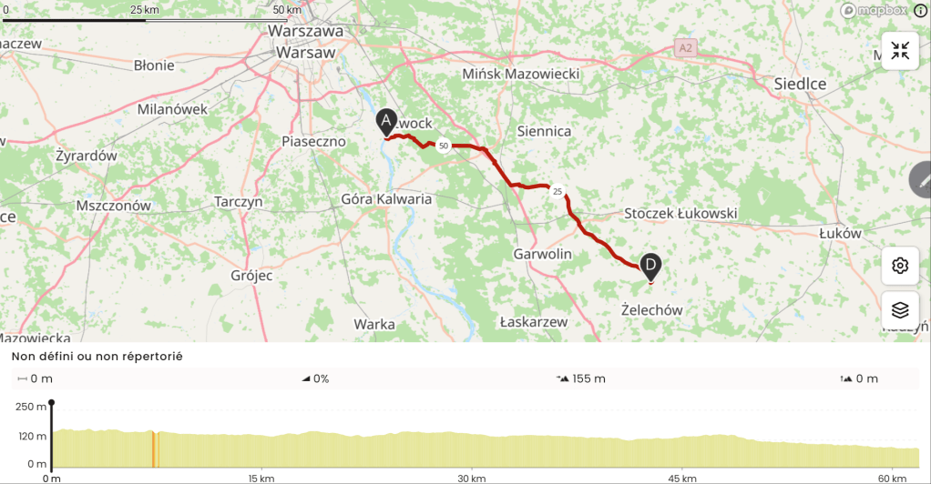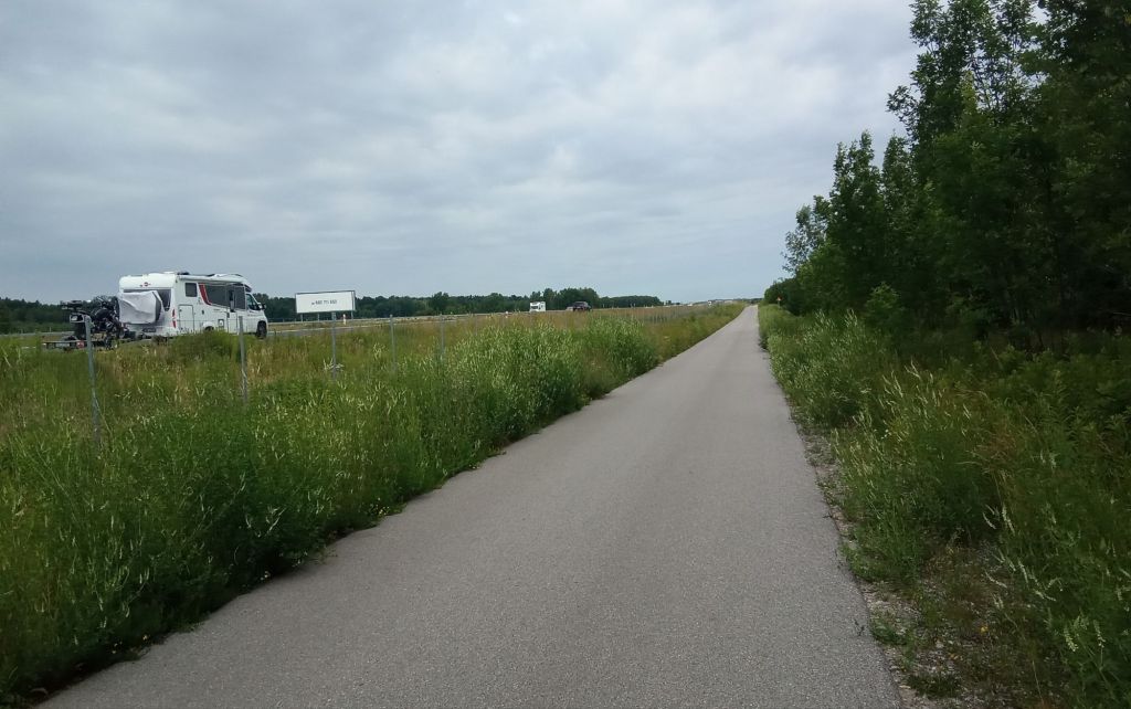 Je continue mon chemin sur de petites routes campagnardes où je traverse à nouveau de nombreux hameaux. Le vent commence à souffler. Après avoir suivi une piste pour couper à travers champs (c’est le moins qu’on puisse dire), je tombe sur l’autoroute S17 qui relie Lublin à Varsovie. Je vais devoir la suivre pendant quelques kms.