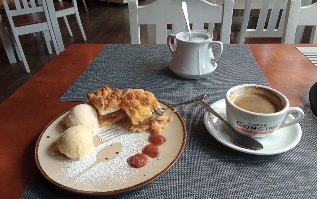Alors que j’arrive dans la ville de Kolbiel à la sortie n°6 de la S17, je repère une station-service où j’espère boire un café. Mais, juste avant, il y a un café-glacerie-brasserie qui est en train d’ouvrir. Il est pile-poil 10h. Je m’y pose. Je commande un americano accompagné d’un apple-pie. La jeune serveuse m’apporte ce gâteau accompagné de 2 boules de glace. Un délice !!!