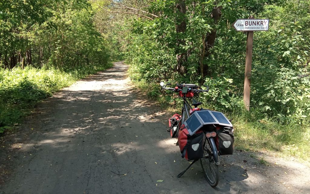 La route goudronnée se transforme bientôt en piste forestière sablonneuse. Moins cool. J’ôte mes lunettes pour tenter de repérer les trous et parties sablonneuses planqués entre ombre et lumière. Un Bunkry est indiqué sur ce panneau.