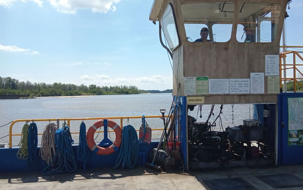 Je finis enfin par rejoindre les rives du fleuve Vistule (la fameuse Wisla que j’ai déjà suivie en le nommant rivière !) . J’ai bien intuité. Il y a un bac qui va me permettre d’atteindre l’autre rive. Quelques cyclistes attendent comme moi.