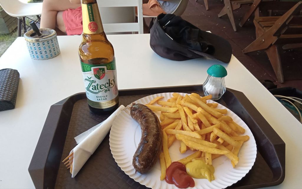 Il s’arrête casser la croûte. J’en fais de même. Ce midi, ce sera boudin (kaszanka)-frite (frytki)-bière (piwo évidemment)- cuisses de cycliste rose ! J’en profite pour faire recharger mon téléphone. Je vais en avoir sacrément besoin pour me guider dans Varsovie.