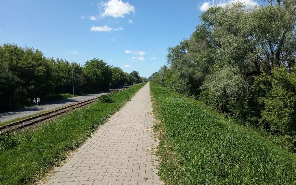Puis la piste cyclable bitumée se transforme en digue pavée. En contrebas, une voie ferrée et une route où circule quelques voitures. Je pense qu’il doit y avoir des accès à des plages sablonneuses le long de la Vistule au vu du nombre de voitures à certains endroits.
