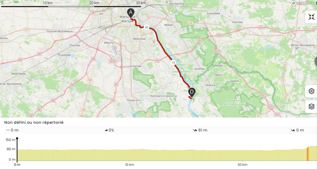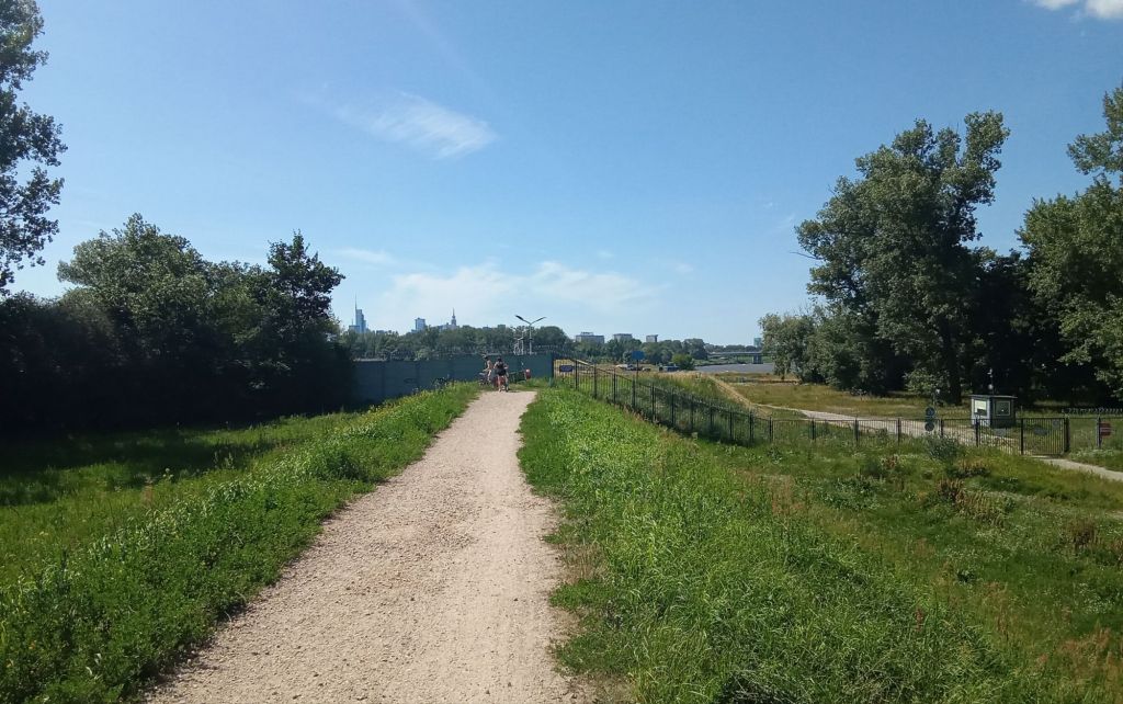 Puis la piste pavée se transforme en chemin caillouteux. Au loin, j’aperçois Varsovie. Par contre, au bout de cette piste, il n’y a plus rien. C’est une zone interdite. J’aurais dû tourner un petit peu avant mais j’ai suivi ce jeune couple.