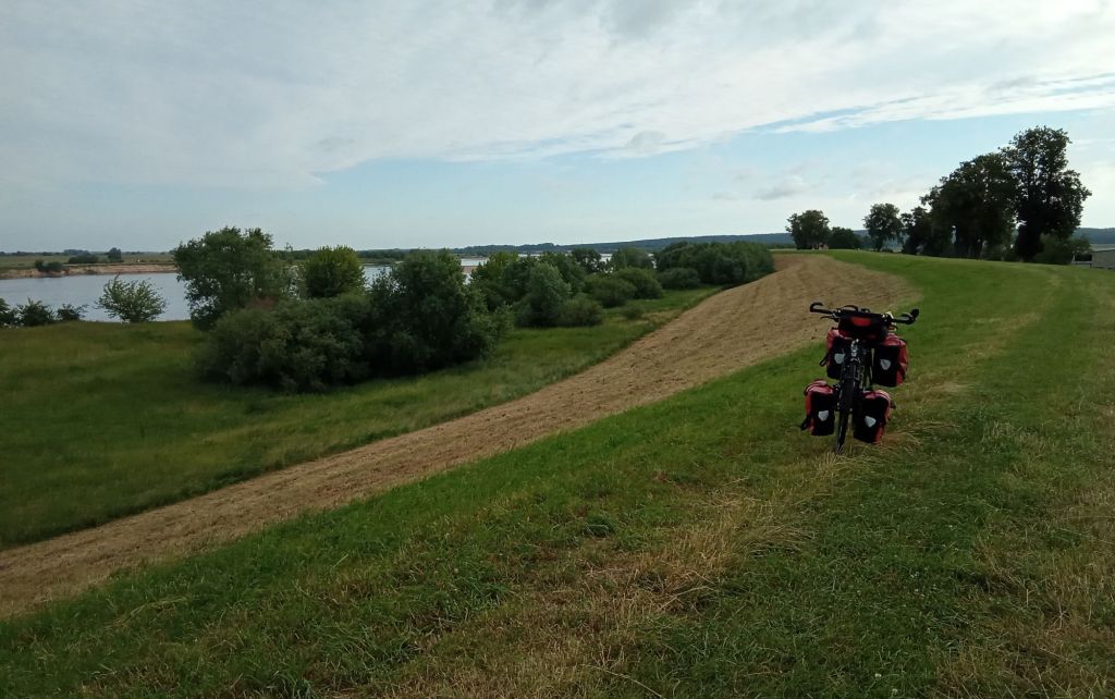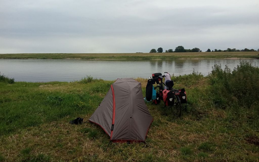 Mais, finalement, alors que je commençais à remonter le long de la Motlawa en suivant de petites routes et traversant de nombreux hameaux, j’ai bifurqué pour passer un dernier bivouac en bordure de la Wisla. Quand on aime … A 16h30, je pose le bivouac vraiment au bord !