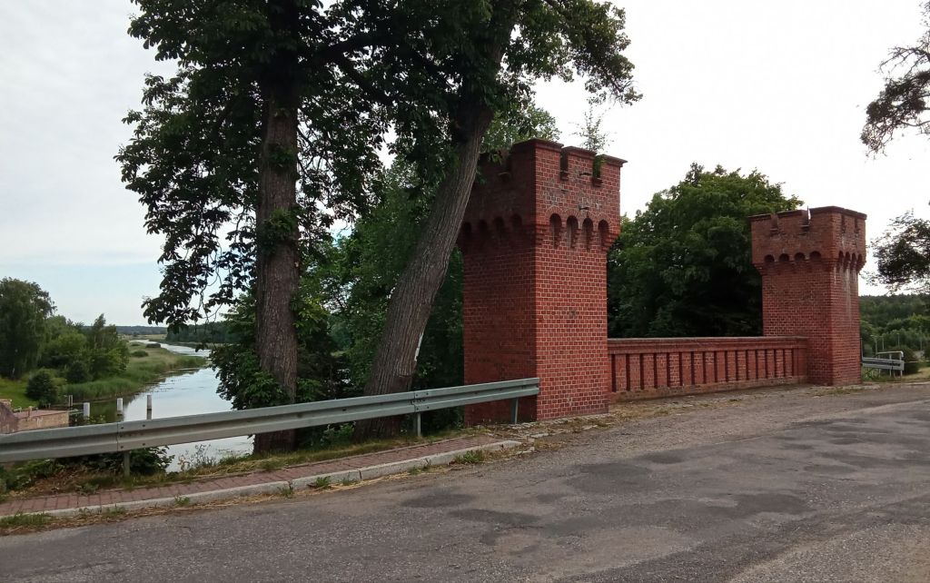 Alors que je viens de rejoindre la route bitumée et de parcourir quelques kms, une biche me nargue du haut de la digue avant de plonger côté fleuve. La journée commence bien ! Je longe ensuite cette digue jusqu’au hameau fantôme de Biala Gora. De là, je rejoins la confluence de la rivière Nogat . Un ancien pont-levis avec deux tours de chaque côté de la route devait faire office de péage.