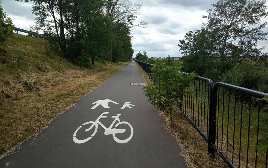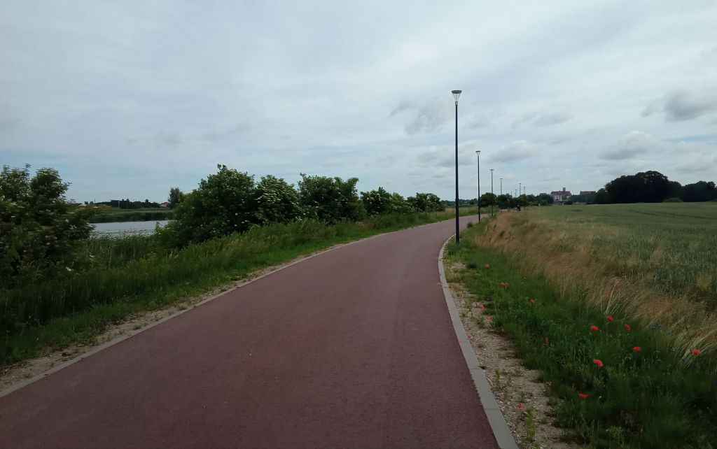 … avant d’arriver par une magnifique voie cyclable/pédestre jusqu’à destination où là, je croise quelques joggeurs promeneurs. Au loin, j’aperçois la forteresse de cette petite ville.